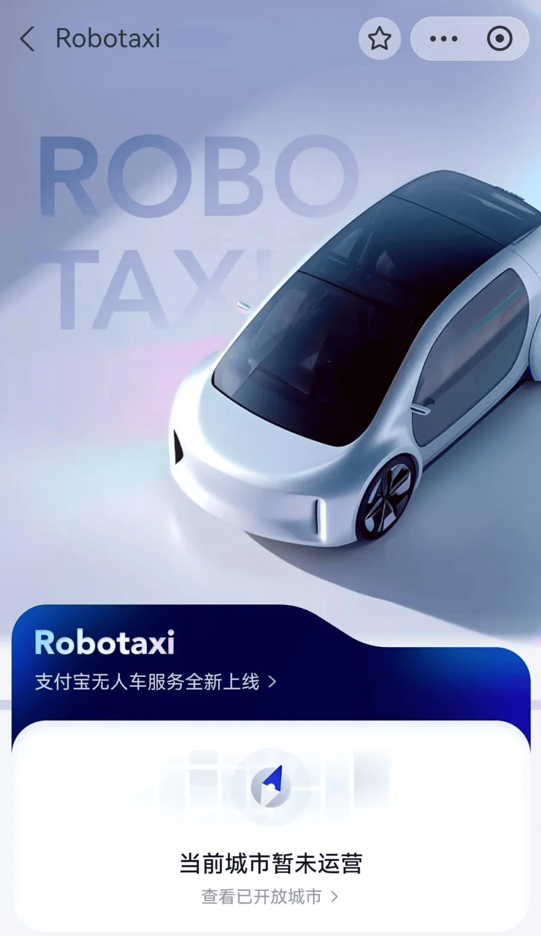 据官方客服,Robotaxi 是支付宝出行频道提供的自动驾驶打车服务平台,目前聚合了小马智行等自动驾驶服务商,但尚未正式推出。